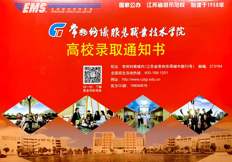 当你收到录取通知书后,请仔细核查信封内所有材料,因为它们对你的大学之路都起着至关重要的引导作用!除此录取信封(见图2)以外的任何材料,均与常州纺织服装职业技术学院无关,学校也未授权任何单位和人员向新生和家长推广各类专转本、专接本培训业务及其他商业服务,特此声明,请考生和家长仔细甄别!
