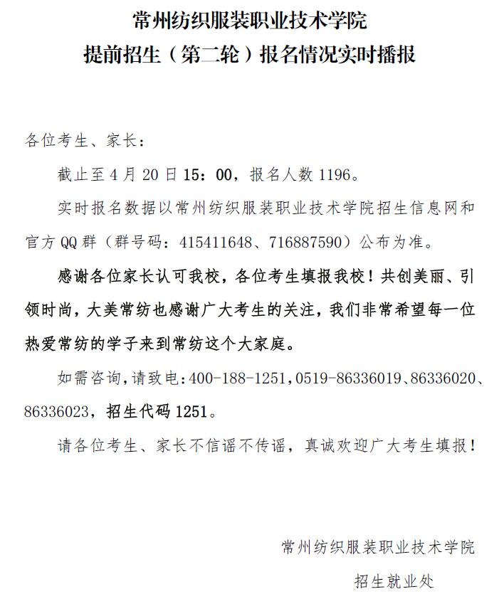 常州纺织服装职业技术学院提前招生(第二轮)报名情况实时播报