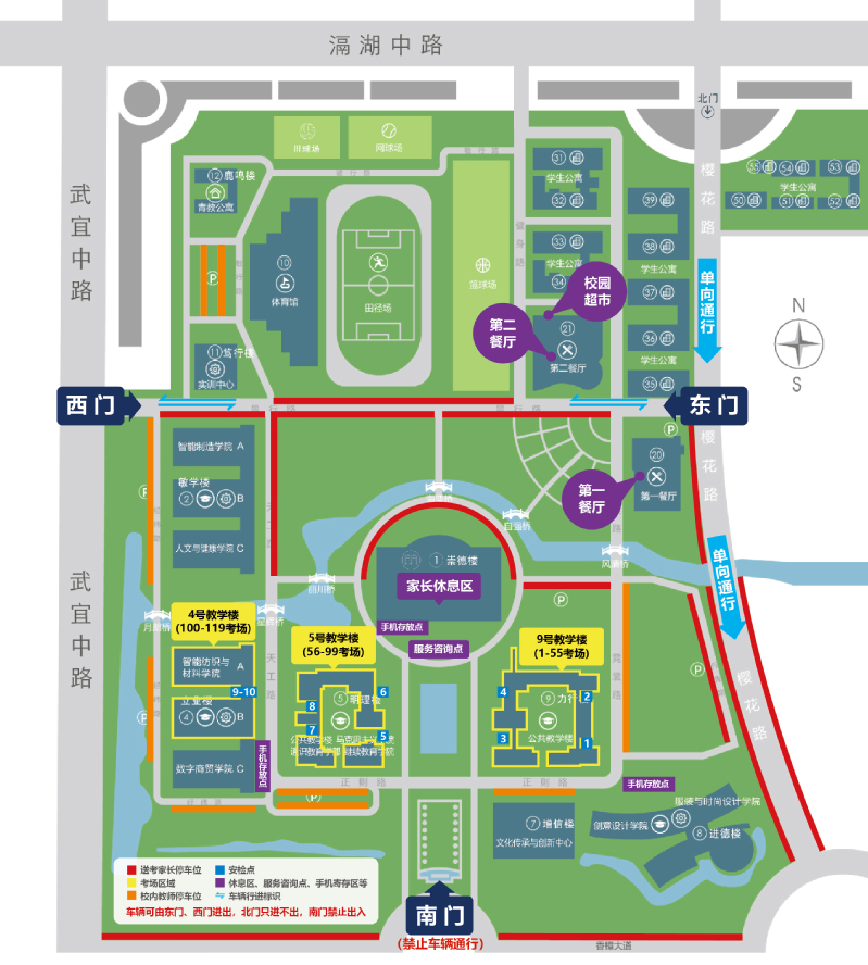 校测考试地点:根据报考实际情况,考试场地为9号教学楼(1-55考场)、5号教学楼(56-99考场)和4号教学楼(100-119考场)。请各位考生根据准考证上的考场信息,前往相应教学楼考场参加考试。