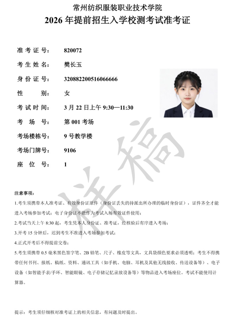 2026年提前招生入学校测考试准考证