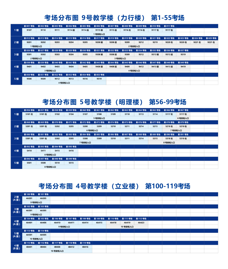 校测考试地点:根据报考实际情况,考试场地为9号教学楼(1-55考场)、5号教学楼(56-99考场)和4号教学楼(100-119考场)。请各位考生根据准考证上的考场信息,前往相应教学楼考场参加考试。